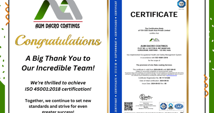 We are proud to announce that Aum Dacro Coatings Unit 1 has successfully achieved ISO 45001:2018 certification!
