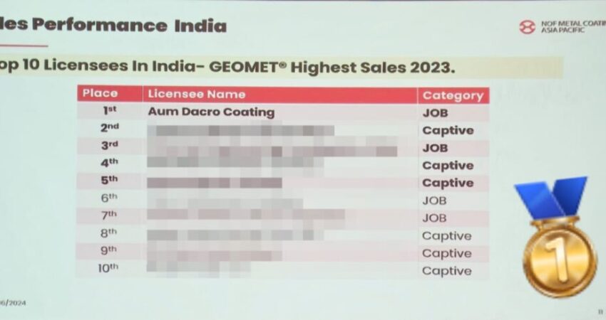 Aum Dacro Coatings is proud to announce that we have achieved the top spot among the Top 10 Licensees in India for Geomet® highest sales in 2023! This recognition is a testament to our dedication and excellence in providing world-class zinc flake coating solutions. Being recognized as the largest Geomet® applicator in India is not […]